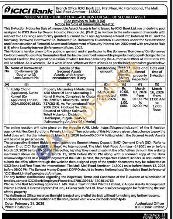Property Measuring 4 Marie Being 4/68 Share Of Land Measuring 3 Kanal 8 Marle, Comprised in Khata No. 228/325, Khasra Νο. 1098/727/2(3-8), As Per Jamabandi Year 2006 2007, Hadbast No. 596, Situated At Village Sakhwan, Tehsil Mukerian, District Hoshiarpur, Punjab-144532) (Admeasuring An Area Of 4 Maria)