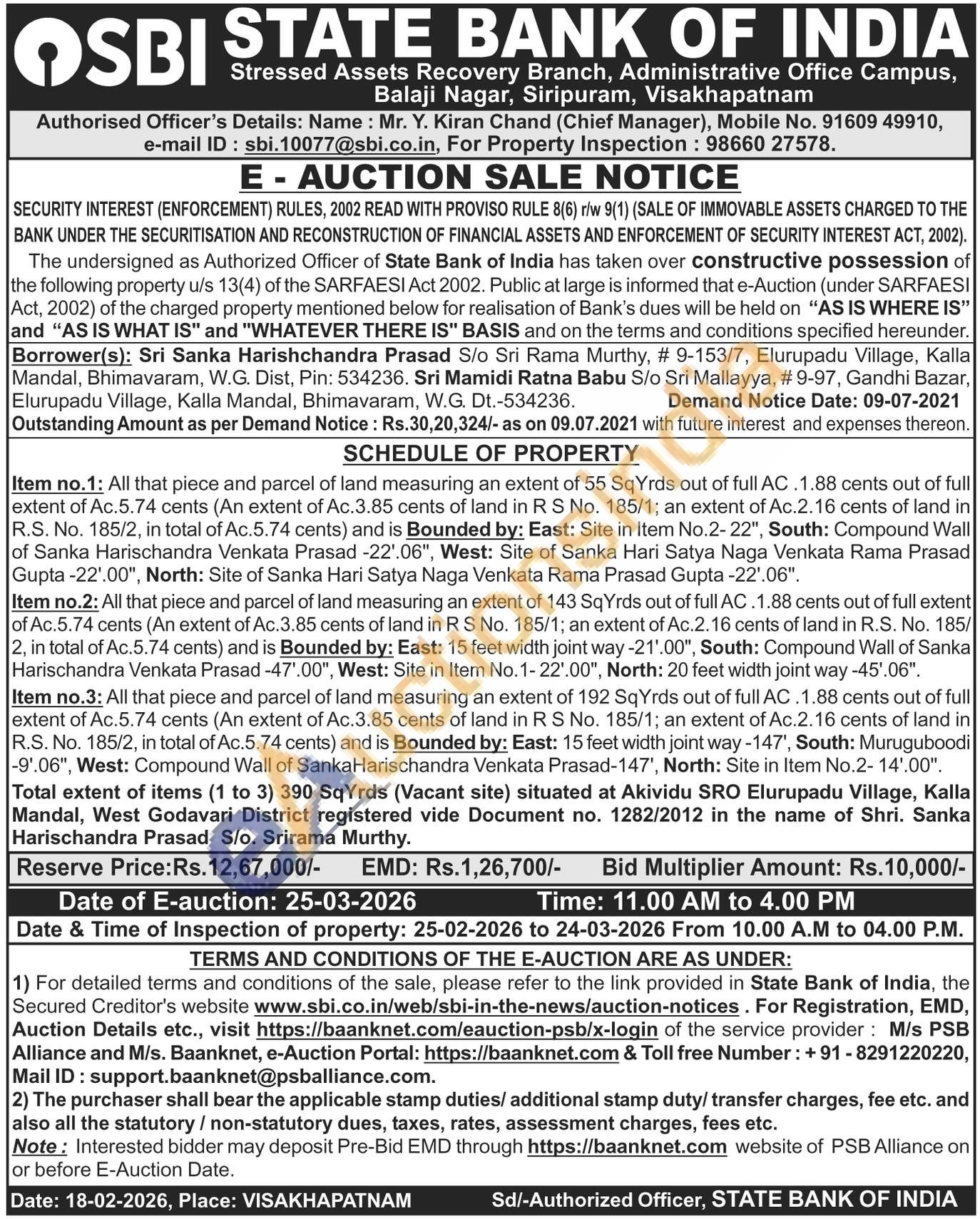 Item no.1: All that piece and parcel of land measuring an extent of 55 SqYrds out of full AC.1.88 cents out of full extent of Ac.5.74 cents (An extent of Ac.3.85 cents of land in R S No. 185/1; an extent of Ac.2.16 cents of land in R.S. No. 185/2, in total of Ac.5.74 cents) and is Bounded by: East: Site in Item No.2-22", South: Compound Wall of Sanka Harischandra Venkata Prasad -22'.06", West: Site of Sanka Hari Satya Naga Venkata Rama Prasad Gupta-22'.00", North: Site of Sanka Hari Satya Naga Venkata Rama Prasad Gupta -22'.06". Item no.2: All that piece and parcel of land measuring an extent of 143 SqYrds out of full AC.1.88 cents out of full extent of Ac.5.74 cents (An extent of Ac.3.85 cents of land in R S No. 185/1; an extent of Ac.2.16 cents of land in R.S. No. 185/2, in total of Ac.5.74 cents) and is Bounded by: East: 15 feet width joint way -21'.00", South: Compound Wall of Sanka Harischandra Venkata Prasad -47'.00", West: Site in Item No.1-22'.00", North: 20 feet width joint way -45'.06". Item no.3: All that piece and parcel of land measuring an extent of 192 SqYrds out of full AC.1.88 cents out of full extent of Ac.5.74 cents (An extent of Ac.3.85 cents of land in R S No. 185/1; an extent of Ac.2.16 cents of land in R.S. No. 185/2, in total of Ac.5.74 cents) and is Bounded by: East: 15 feet width joint way-147', South: Muruguboodi -9'.06", West: Compound Wall of SankaHarischandra Venkata Prasad-147', North: Site in Item No.2-14'.00". Total extent of items (1 to 3) 390 SqYrds (Vacant site) situated at Akividu SRO Elurupadu Village, Kalla Mandal, West Godavari District registered vide Document no. 1282/2012 in the name of Shri. Sanka Harischandra Prasad S/o. Srirama Murthy.