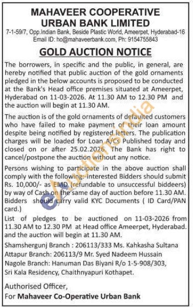 MAHAVEER CO-OPERATIVE URBAN BANK LIMITED Gold Auctions Auction in Murshidabad