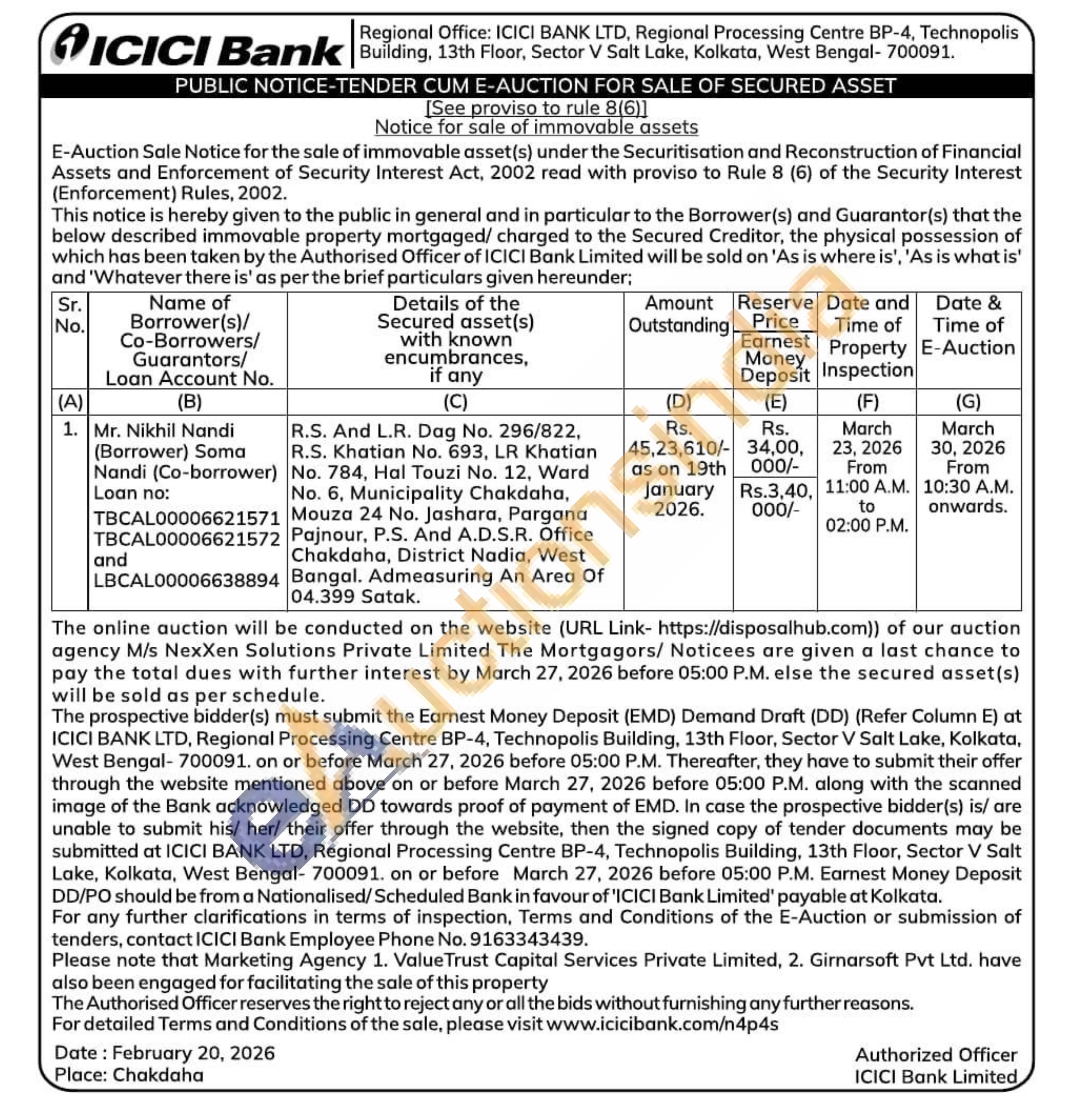 R.S. And L.R. Dag No. 296/822, R.S. Khatian No. 693, LR Khatian No. 784, Hal Touzi No. 12, Ward No. 6. Municipality Chakdaha, Mouza 24 No. Jashara, Pargana Pajnour, P.S. And A.D.S.R. Office Chakdaha, District Nadia, West Bangal. Admeasuring An Area Of 04.399 Satak.