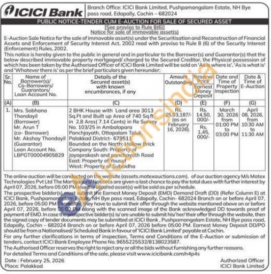 2 BHK House with Land area 3013 Sq Ft and Built up Area of 740 Sq.ft in 2.8 Ares (7.14 Cents) in Re Survey No. 103/25 in Ambalapara Panchjayath, Ottapalam Taluk, Palakkad District-679511 Bounded on the North: Hollow Brick Company South: Property of Jayaprakash and panchayath Rood East: Property of Yousuf West: Property of Subaidha