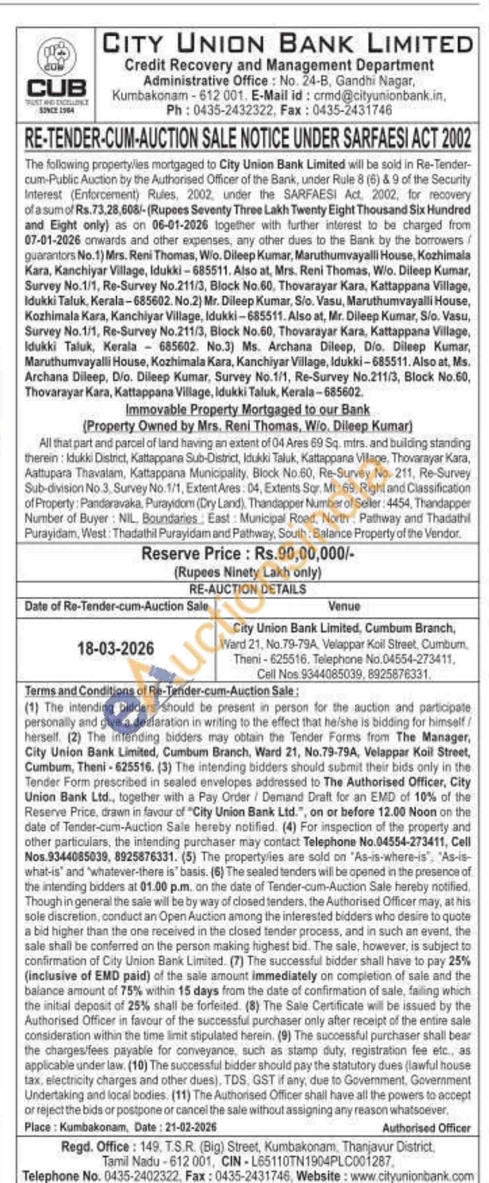 All that part and parcel of land having an extent of 04 Ares 69 Sq. mirs. and building standing therein: Idukki District, Kattappana Sub-District, Idukki Taluk, Kattappana Village. Thovarayar Kara, Aattupara Thavalam, Kattappana Municipality, Block No.60, Re-Survey No. 211, Re-Survey Sub-division No.3. Survey No. 1/1, Extent Ares 04, Extents Sor. Mt: 69, Right and Classification of Property: Panderavaka, Purayidom (Dry Land), Thandapper Number of Seller: 4454, Thandapper Number of Buyer: NIL, Boundaries, East Municipal Road, North Pathway and Thadathil Purayidam, West: Thadathil Purayidam and Pathway, South: Balance Property of the Vendor