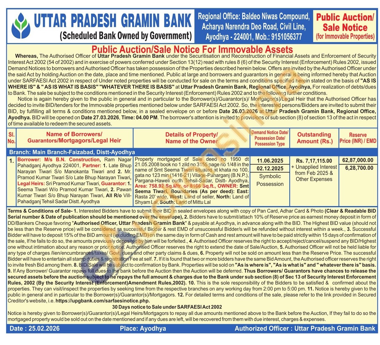 Property mortgaged of Sale deed no 1950 dt 21.05.2008 book no 1 zild no 3155 page no 1/48 in the name of Smt Seema Tiwari situated at khata no 100, gata no 123 min (1416-21) Vilage-Paharganj (B.N.P.).Pargana-Haweli oudh Tehsil-Sadar, Distt- Ayodhya, Area: 758.92 Sq.Mtr. or 8166 Sq.ft., OWNER: Smt Seema Tiwari, Boundaries (As per deed): East: Rasta 20' wide, West: Land of seller, North: Land of Shyam Lal, South: Land of Mittu Lal
