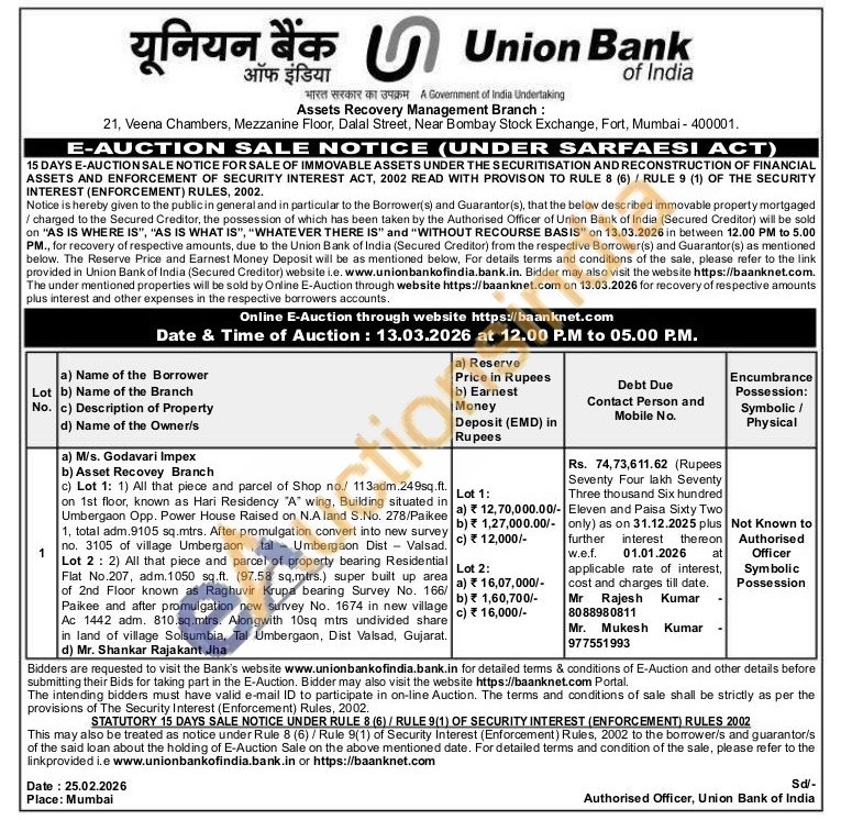 c) Lot 1: 1) All that piece and parcel of Shop no./ 113adm.249sq.ft. on 1st floor, known as Hari Residency "A" wing, Building situated in Umbergaon Opp. Power House Raised on N.A land S.No. 278/Paikee 1, total adm.9105 sq.mtrs. After promulgation convert into new survey no. 3105 of village Umbergaon tal Umbergaon Dist Valsad. Lot 2: