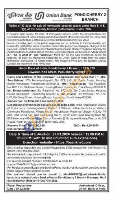 Description of immovable secured assets to be Sold: In the Registration District of Puducherry. Sub-Registration District of Villkanur, within the limits of Villanur Commune Panchayat, Village No:33. Kurumbapet Revenue Village, R.S.No 7/1 part, Cad. No.34 part, land measuring 162 sq mt and House bearing Door No. 672 thereon and Bounded by: East of Ramesh Murugavel House, West of No 671 House. North of Road, South of Tamil Nadu Limit