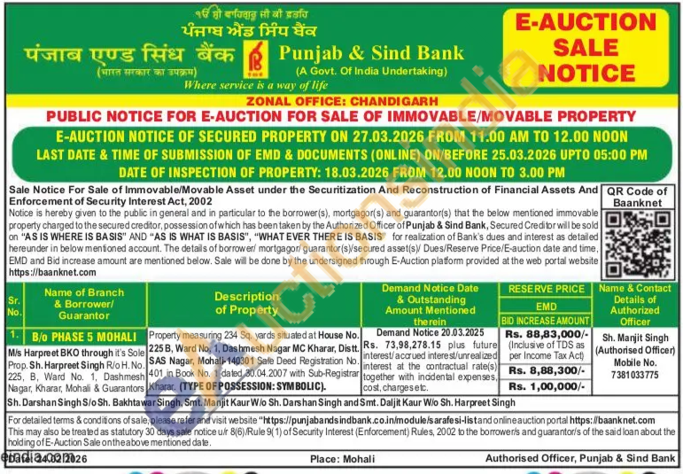 Property measuring 234 Sq. yards situated at House No. 225 B, Ward No. 1, Dashmesh Nagar MC Kharar, Distt. SAS Nagar, Mohali-140301 Sale Deed Registration No. 401 in Book No. 1 dated 30.04.2007 with Sub-Registrar Kharar. (TYPE OF POSSESSION: SYMBOLIC)