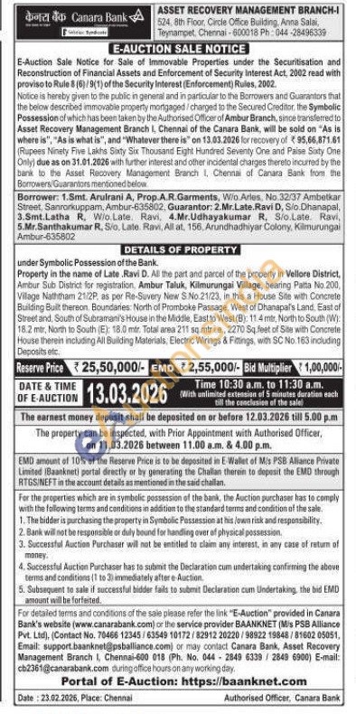 . All the part and parcel of the property in Vellore District, Ambur Sub District for registration, Ambur Taluk, Kilmurungai Village, bearing Patta No.200, Village Naththam 21:2P, as per Re-Suvery New S No 21/23, in this a House Site with Concrete Building Built thereon, Boundaries: North of Promboke Passage, West of Dhanapal's Land, East of Street and, South of Subramani's House in the Middle, East to West(B): 114 mir, North to South (W): 18.2 mer, North to South (E): 18.0 mtr. Total area 211 sq.mtrie., 2270 Sq feet of Site with Concrete House therein including All Building Materials, Electric Wirings & Fittings, with SC No.163 including Deposits etc