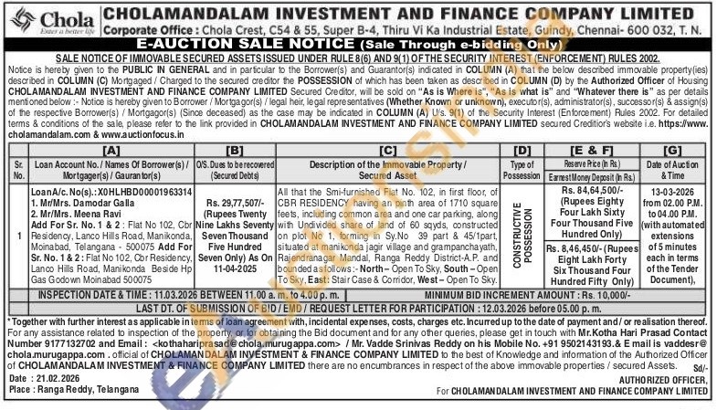 All that the Smi-furnished Flat No. 102, in first floor, of CBR RESIDENCY having an pinth area of 1710 square feets, including common area and one car parking, along with Undivided share of land of 60 sqyds, constructed on plot No 1, forming in Sy.No 39 part & 45/1part, situated at manikonda jagir village and grampanchayath, Rajendranagar Mandal, Ranga Reddy District-A.P. and bounded as follows:- North-Open To Sky, South-Open To Sky, East: Stair Case & Corridor, West-Open To Sky