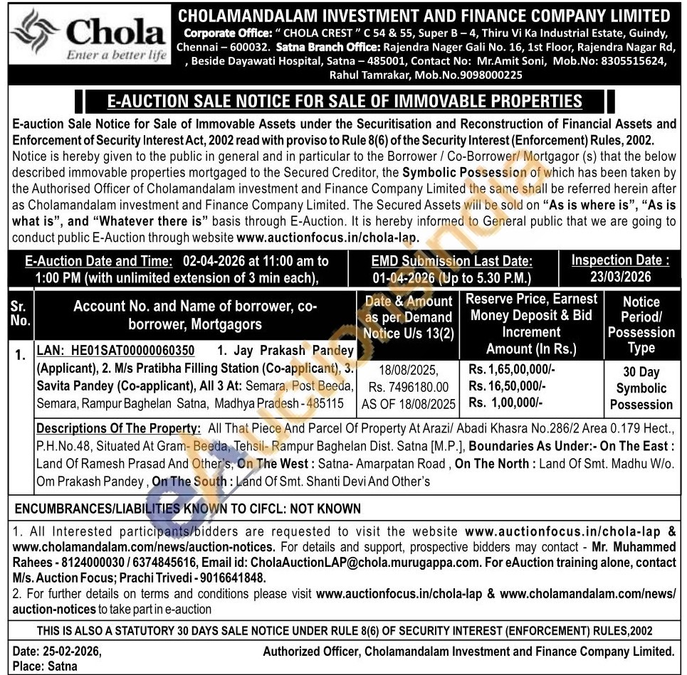 Descriptions Of The Property: All That Piece And Parcel Of Property At Arazi/ Abadi Khasra No.286/2 Area 0.179 Hect., P.H.No.48, Situated At Gram- Beeda, Tehsil- Rampur Baghelan Dist. Satna [M.P.], Boundaries As Under:- On The East: Land Of Ramesh Prasad And Other's, On The West: Satna- Amarpatan Road, On The North: Land Of Smt. Madhu W/o. Om Prakash Pandey, On The South: Land Of Smt. Shanti Devi And Other's