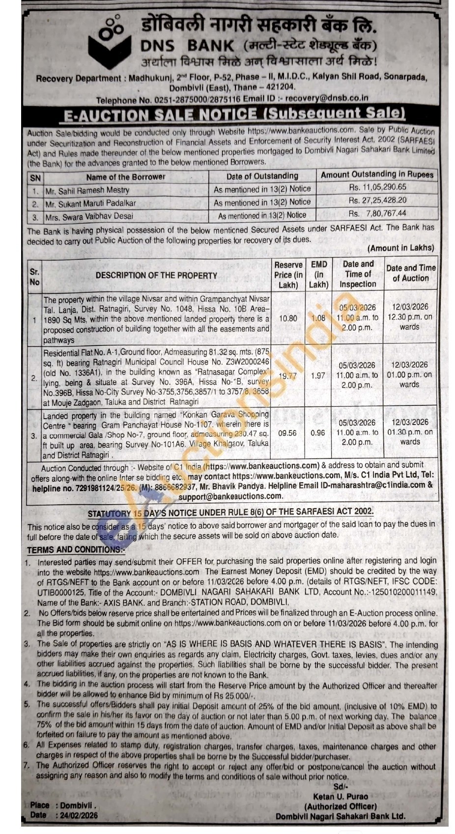 Landed property in the building named "Konkan Garava Shopping Centre bearing Gram Panchayat House No-1107, wherein there is a commercial Bala /Shop No-7, ground floor, admeasuring 230.47 sq. ft built up area, bearing Survey No-101A6. Village Khalgaov, Taluka and District Ratnagiri