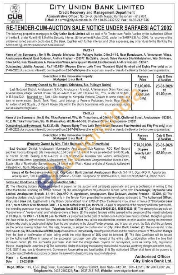(Property Owned by Mrs. Tikka Rajeswari, W/o. Trimurthulu) : East Godavari District, Amalapuram Municipality, Amalapuram Sub-Registrar. RCC Roof Ground and First Floor building with Site measuring Ac. 0.04 Cents in full ie Ac: 0.14 1/2 is an extent of 194.63 Sq. yds. or 162.87 Sq.mts. bearing D.No.4-4-91/5 in R.S.No.495/8 at Kurasala Vari Veedhi, Amalapuram, East Godavari District. Boundaries & Measurement: East: Site of Medidi Gangadhara Rao 45 feet 4 inch.. South: Site of Rankireddy Satyanarayana 38 feet 6 inch. West: House and site of Kurasala Adilakshmi 45 feet 4 inch, North: 9 feet wide passage 38 feet 6 inch