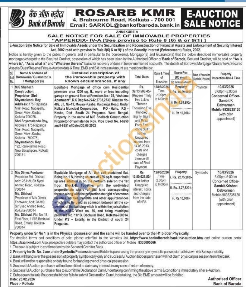 Equitable Mortgage of All that self contained flat, Being No-1 B, Having an area of 775 sq.ft. super built up area situated in on the northern side on the 1st floor, Block-B, Together with the undivided proportionate share of the land corresponding thereto along with the proportionate right of common facilities, utilities, benefits and other appurtenances which is to be used as common between all the co-owners of the building witch is within the jurisdiction of the K.M.C Ward no. 55, and being municipal premises No. 11/1B, Bechulal Road, Kolkata-700014, Under P.S Entally, in the District of south 24 Praganas.