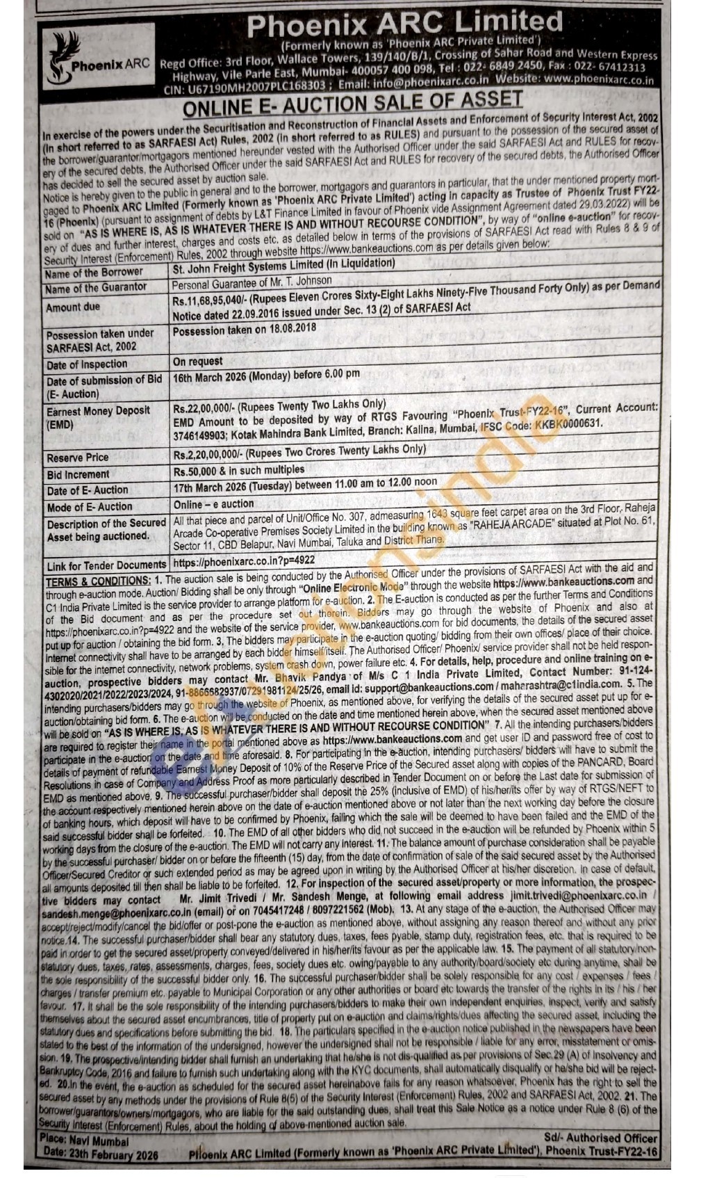 Al that piece and parcel of Unit/Office No. 307, edmeasuring 1643 square feet carpet area on the 3rd Floor, Raheja Arcade Co-operative Premises Society Limited in the building known as "RAHEJA ARCADE" situated at Plot No. 61, Sector 11, CBD Belapur, Navi Mumbai, Taluka and District Thane