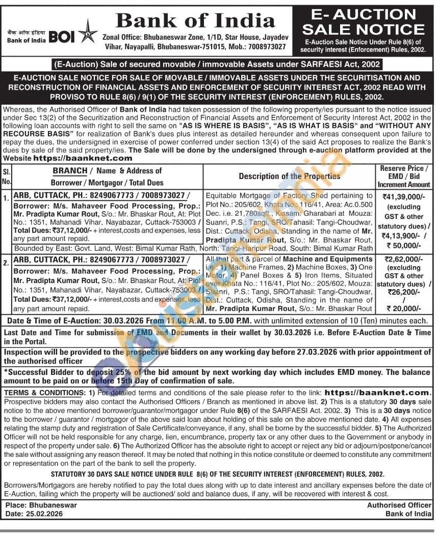 Equitable Mortgage of Factory Shed pertaining to Plot No.: 205/602, Khata No.: 116/41, Area: Ac.0.500 Dec. i.e. 21,780sqft., Kissam: Gharabari at Mouza: Suanri, P.S.: Tangi, SRO/Tahasil: Tangi-Choudwar, Dist.: Cuttack, Odisha, Standing in the name of Mr. Pradipta Kumar Rout, S/o.: Mr. Bhaskar Rout, North: Tangi-Haripur Road, South: Bimal Kumar Rath