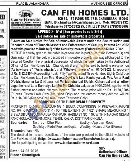 PROPERTY ID-1465/1 MEASURING 1 BISWA COMPRISING IN KHEWAT/KHATONI NO. 6/7 KHASRA NO. 70(31-4) TO THE EXTENT OF 1/624 SHARE MEASURING 1 BISWA SITUATED AT MAUJA RATHPUR, HADBAST NO. 116, WITHIN NAGAR NIGAM PANCHKULAZONE PINJORE, TEHSIL KALKA, DISTT PANCHKULA.