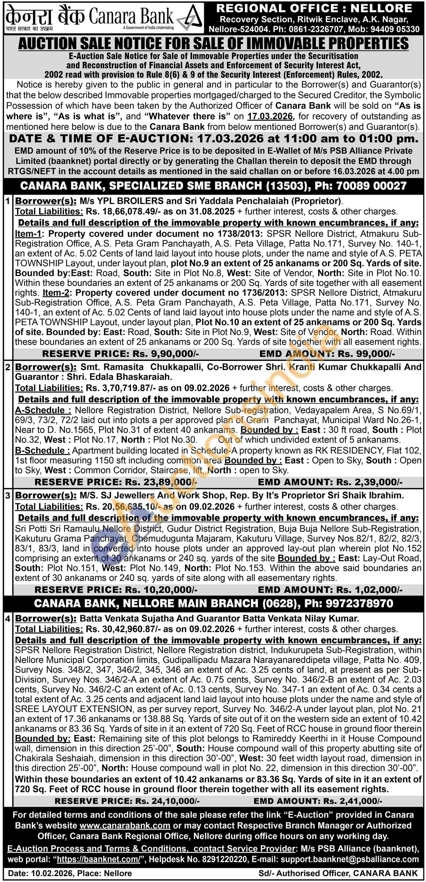 Details and full description of the immovable property with known encumbrances, if any: A-Schedule: Nellore Registration District, Nellore Sub-registration, Vedayapalem Area, S No.69/1 69/3, 73/2, 72/2 laid out into plots a per approved plan of Gram Panchayat, Municipal Ward No.26-1, Near to D. No. 1565, Plot No.31 of extent 40 ankanams. Bounded by: East: 30 ft road, South: Plot No.32, West: Plot No.17, North: Plot No.30. Out of which undivided extent of 5 ankanams. B-Schedule: Apartment building located in Schedule-A property known as RK RESIDENCY, Flat 102. 1st floor measuring 1150 sft including common area Bounded by: East: Open to Sky, South: Open to Sky, West: Common Corridor, Staircase, lift, North: open to Sky.