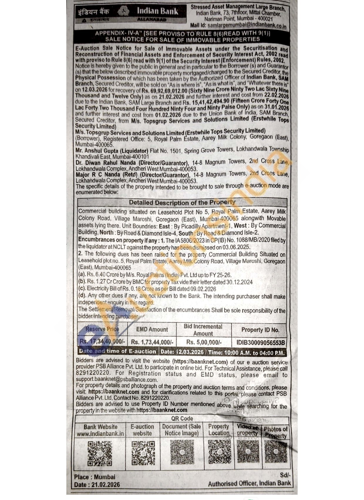 Commercial building situated on Leasehold Plot No 5, Royal Palm Estate, Aarey Milk Colony Road, Village Maroshi, Goregaon (East), Mumbai-400065 alongwith Movable assets lying there. Unit Boundries: East: By Picadilly Apartment-1, West: By Commercial Building, North: By Road & Diamond Isle-4, South: By Road & Diamond Isle-2. Encumbrances on property if any: 1. The IA 5806/2023 in CP(IB) No. 1088/MB/2020 filed by the liquidator at NCLT against the property has been dismissed on 03.06.2025. 2. The following dues has been raised for the property Commercial Building Situated on Leasehold plot no. 5, Royal Palm Estate, Aarey Milk Colony Road, Village Maroshi, Goregaon (East), Mumbai-400065 (a). Rs. 6.40 Crore by M/s. Royal Palms (India) Pvt. Ltd up to FY 25-26. (b). Rs. 1.27 Cr Crore by BMC for property Tax vide their letter dated 30.12.2024 (c). Electricity Bill of Rs. 0.18 Crore as per Bill dated 09.02.2026 (d). Any other dues if any, are not known to the Bank. The intending purchaser shall make independent enquiry in this regard. The Settlement/Removal/Satisfaction of the encumbrances Shall be sole responsibility of the bidder/intending purchaser.