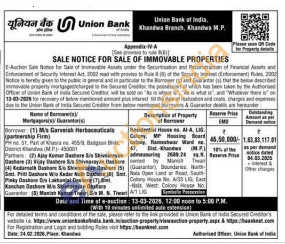 Residential House no. Al-A, LIG. Colony. MP Housing Board colony, Rameshwar Ward no. 47, Dist.-Khandwa (M.P.) admeasuring 2689.24 sq.ft. owned by Manish Tiwari (Guarantor), Boundaries: North-Nala Open Land or Road, South-Colony House No. A/33 LIG, East -Nala, West Colony House No. A/1 LIG