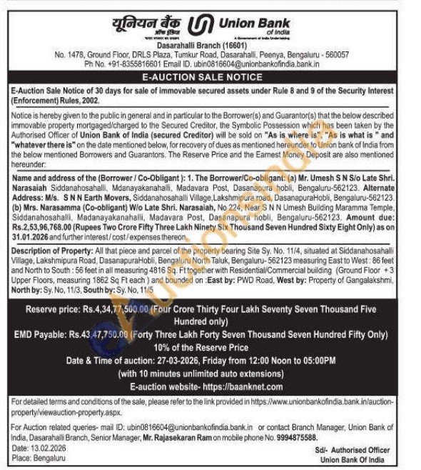 All that piece and parcel of the property bearing Site Sy. No. 11/4, situated at Siddanahosahalli Village, Lakshmipura Road, Dasanapura Hobli, Bengaluru North Taluk, Bengaluru-562123 measuring East to West: 86 feet and North to South: 56 feet in all measuring 4816 Sq. Ft together with Residential/Commercial building (Ground Floor +3 Upper Floors, measuring 1862 Sq Ft each) and bounded on : East by: PWD Road, West by: Property of Gangalakshmi. North by: Sy. No, 11/3, South by: Sy. No, 11/5