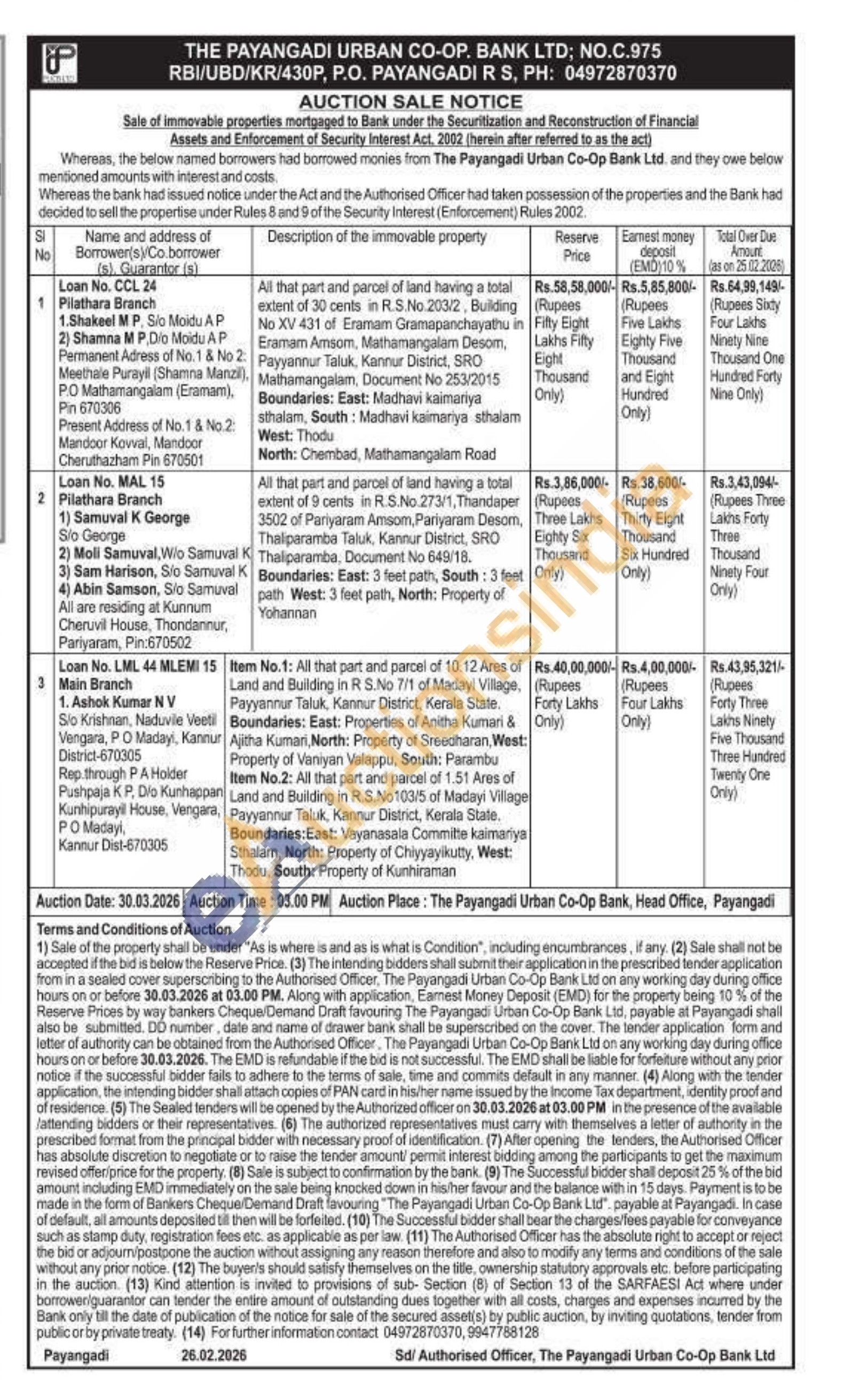 Item No.1: All that part and parcel of 10.12 Ares of Land and Building in R S.No 7/1 of Madayi Village. Payyannur Taluk, Kannur District, Kerala State Boundaries: East: Properties of Anitha Kumari & Ajitha Kumari, North: Property of Sreedharan, West: Property of Vaniyan Valappu, South: Parambu Item No.2: All that part and parcel of 1.51 Ares of Land and Building in R.S.No103/5 of Madayi Village Payyannur Taluk, Kannur District, Kerala Stale. Boundaries:East: Vayanasala Committe kaimariya Sthalam, North: Property of Chiyyayikutty, West: Thodu, South: Property of Kunhiraman