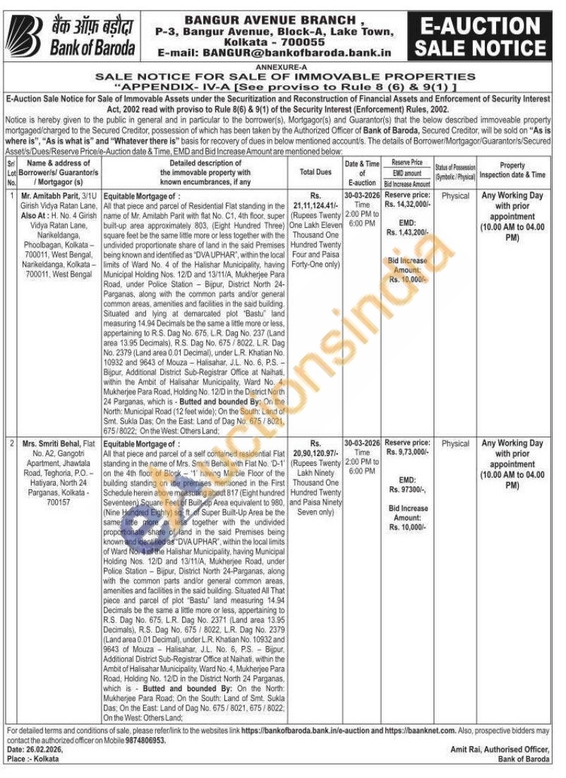All that piece and parcel of a self contained residential Flat standing in the name of Mrs. Smriti Behal with Flat No. 'D-1' on the 4th floor of Block having Marble Floor of the building standing on the premises mentioned in the First Schedule herein above measuring about 817 (Eight hundred Seventeen) Square Feet of Built-up Area equivalent to 980, (Nine Hundred Eighty) sq. ft. of Super Built-Up Area be the same little more or less together with the undivided proportionate share of land in the said Premises being known and identified as "DVA UPHAR", within the local limits of Ward No. 4 of the Halishar Municipality, having Municipal Holding Nos. 12/D and 13/11/A, Mukherjee Road, under Police Station Bijpur, District North 24-Parganas, along with the common parts andior general common areas. amenities and facilities in the said building. Situated All That piece and parcel of plot "Bastu" land measuring 14.94 Decimals be the same a little more or less, appertaining to R.S. Dag No. 675, L.R. Dag No. 2371 (Land area 13.95 Decimals), R.S. Dag No. 675/ 8022. L.R. Dag No. 2379 (Land area 0.01 Decimal), under LR. Khatian No. 10932 and 9643 of Mouza Halisahar, J.L. No. 6, P.S. Bijpur Additional District Sub-Registrar Office at Naihati, within the Ambit of Halisahar Municipality, Ward No. 4. Mukherjee Para Road, Holding No. 12/D in the District North 24 Parganas, which is Butted and bounded By: On the North: Mukherjee Para Road, On the South: Land of Smt. Sukla Das: On the East: Land of Dag No. 675/8021,675/8022: On the West: Others Land: