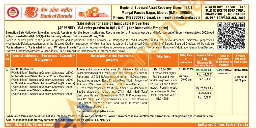 1. Residential property in the name of Mohd Rizvan Ahmad S/o . Islam Ahmad situated at Moh. Badi Taraf Shekhpura Kadeem, Saharanpur-247001, U.P. Admeasuring area 146.90 sq. yards. . Boundaries as under: East 13 Wide Road, North: Property of Ali Ahmad, West: Res. of Parveen, South: Res. of Usman