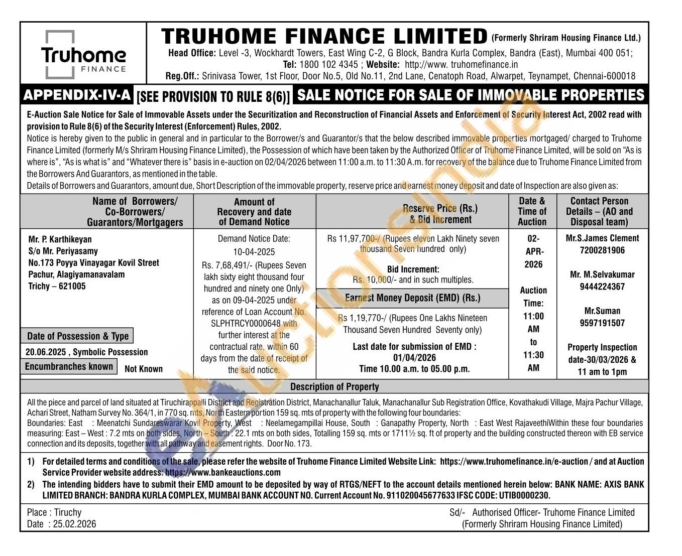 All the piece and parcel of land situated at Tiruchirappalli District and Registration District, Manachanallur Taluk, Manachanallur Sub Registration Office, Kovathakudi Village, Majra Pachur Village, Achari Street, Natham Survey No. 364/1, in 770 sq. mts, North Eastern portion 159 sq. mts of property with the following four boundaries: Boundaries: East Meenatchi Sundareswarar Kovil Property, West: Neelamegampillai House, South Ganapathy Property, North East West Rajaveethi Within these four boundaries measuring: East-West: 7.2 mts on both sides, North-South: 22.1 mts on both sides, Totalling 159 sq. mts or 1711½ sq. ft of property and the building constructed thereon with EB service connection and its deposits, together with all pathway and easement rights. Door No. 173.