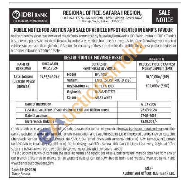 DETAILS OF HYPOTHECATED VEHICLE Model Hyundai Variant Creta 1.5 CRDI MTE (Diesel Registration No MH-53-A-1303 Engine No DAFASM397276 Colour ATLAS WHITE