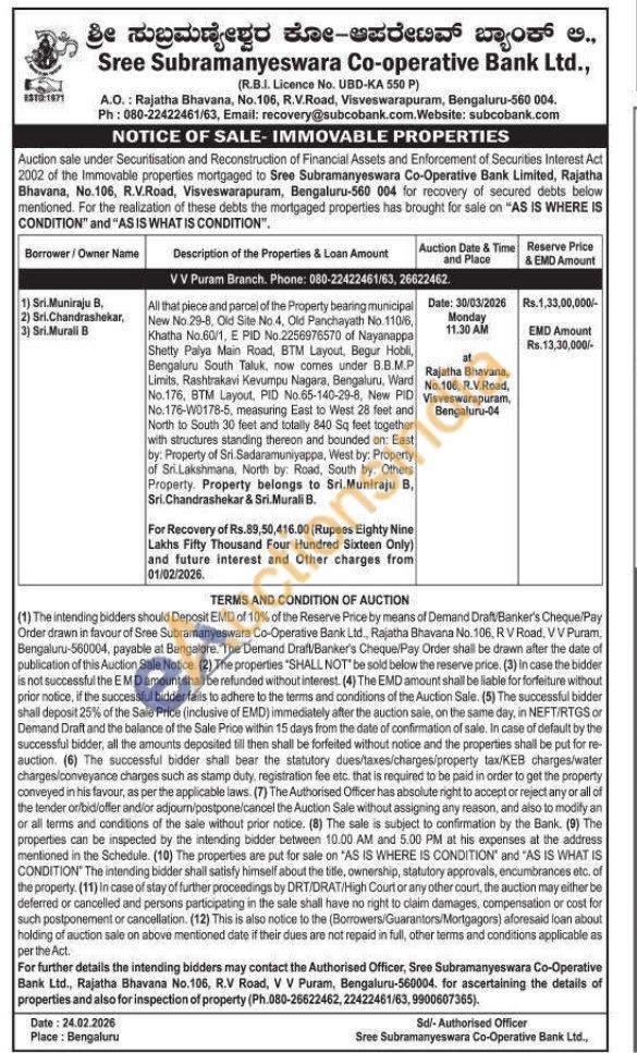 All that piece and parcel of the Property bearing municipal New No.29-8, Old Site No.4, Old Panchayath No. 110/6, Khatha No.60/1, E PID No.2256976570 of Nayanappa Shetty Palya Main Road, BTM Layout, Begur Hobli, Bengaluru South Taluk, now comes under B.B.M.P Limits, Rashtrakavi Kevumpu Nagara, Bengaluru, Ward No.176, BTM Layout, PID No.65-140-29-8, New PID No.176-W0178-5, measuring East to West 28 feet and North to South 30 feet and totally 840 Sq feet together with structures standing thereon and bounded on: East by: Property of Sri.Sadaramuniyappa, West by: Property of Sri.Lakshmana, North by: Road, South by: Others Property. Property belongs to Sri.Muniraju B, Sri.Chandrashekar & Sri. Murali B.