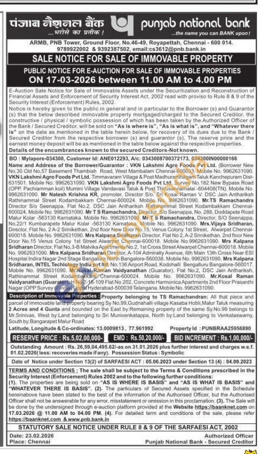 Property belonging to TS Ramachandran: All that piece and parcel of immovable land property bearing Sy No.99. Gudnahalli village Kasaba Hobii, Malur Taluk measuring 2 Acres and 4 Gunta and bounded on the East by: Remaining property of the same Sy.No.99 belongs to Mr.Srinivas, West by Land belonging to Sn Munivenkatappa, North by Land belonging to Venkataswamy. South by Bangarapet Malur Road