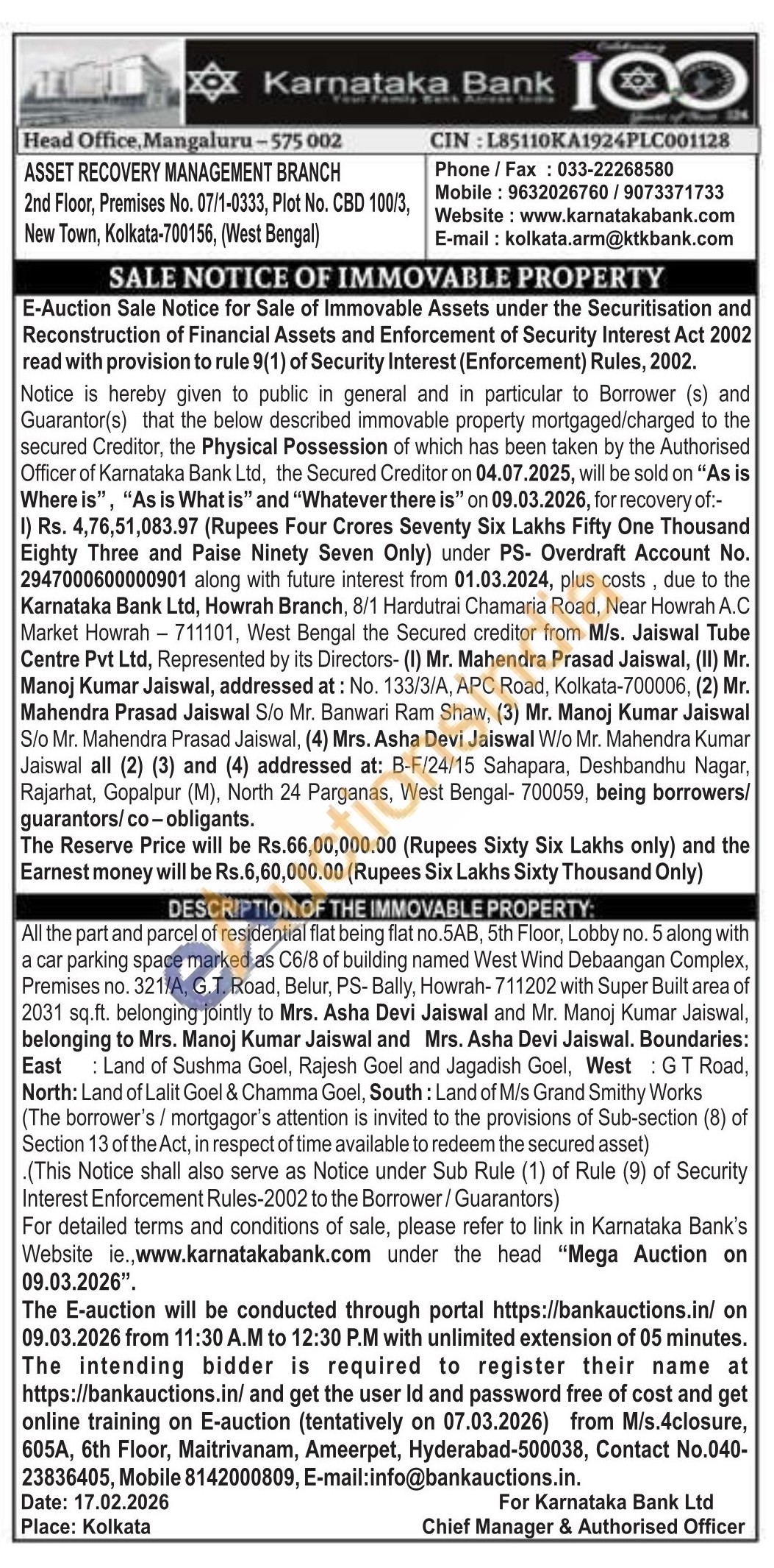 All the part and parcel of residential flat being flat no.5AB, 5th Floor, Lobby no. 5 along with a car parking space marked as C6/8 of building named West Wind Debaangan Complex, Premises no. 321/A, G.T. Road, Belur, PS- Bally, Howrah-711202 with Super Built area of 2031 sq.ft. belonging jointly to Mrs. Asha Devi Jaiswal and Mr. Manoj Kumar Jaiswal, belonging to Mrs. Manoj Kumar Jaiswal and Mrs. Asha Devi Jaiswal. Boundaries: East : Land of Sushma Goel, Rajesh Goel and Jagadish Goel, West GT Road, North: Land of Lalit Goel & Chamma Goel, South: Land of M/s Grand Smithy Works