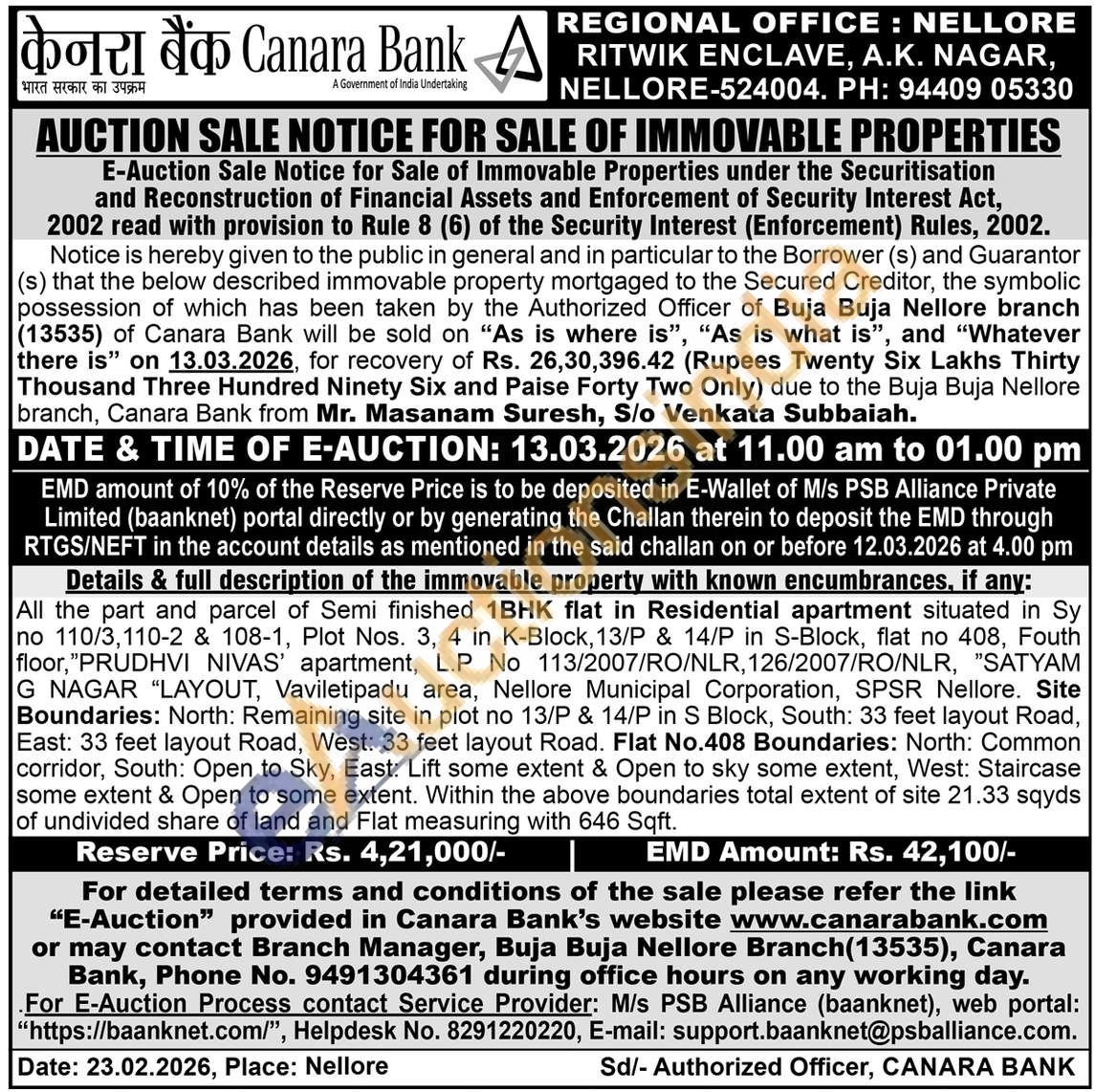 All the part and parcel of Semi finished 1BHK flat in Residential apartment situated in Sy no 110/3,110-2 & 108-1, Plot Nos. 3, 4 in K-Block, 13/P & 14/P in S-Block, flat no 408, Fouth floor, "PRUDHVI NIVAS' apartment, L.P No 113/2007/RO/NLR, 126/2007/RO/NLR, "SATYAM G NAGAR "LAYOUT, Vaviletipadu area, Nellore Municipal Corporation, SPSR Nellore. Site Boundaries: North: Remaining site in plot no 13/P & 14/P in S Block, South: 33 feet layout Road, East: 33 feet layout Road, West: 33 feet layout Road. Flat No.408 Boundaries: North: Common corridor, South: Open to Sky, East: Lift some extent & Open to sky some extent, West: Staircase some extent & Open to some extent. Within the above boundaries total extent of site 21.33 sqyds of undivided share of land and Flat measuring with 646 Sqft.