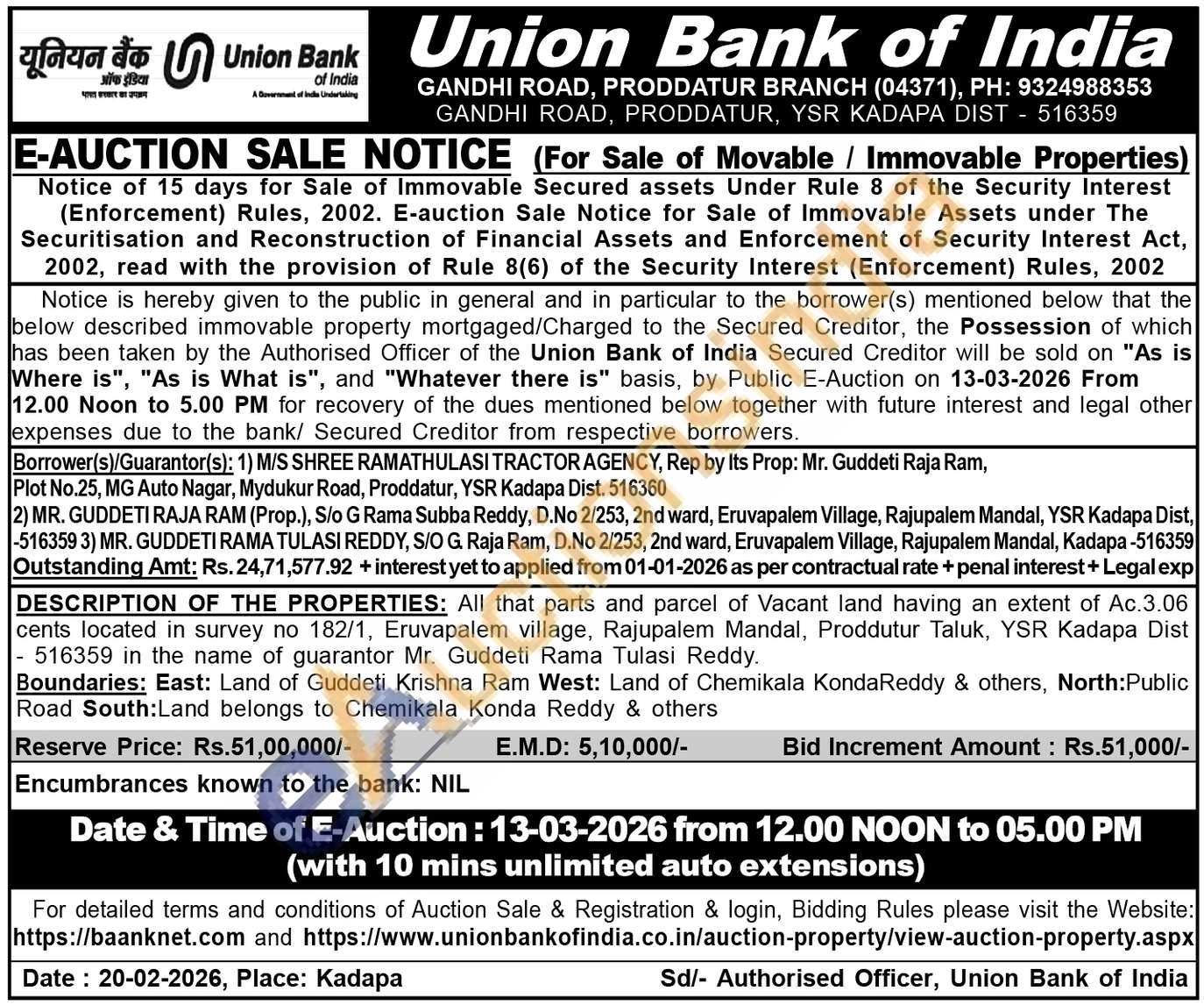 DESCRIPTION OF THE PROPERTIES: All that parts and parcel of Vacant land having an extent of Ac.3.06 cents located in survey no 182/1, Eruvapalem village, Rajupalem Mandal, Proddutur Taluk, YSR Kadapa Dist 516359 in the name of guarantor Mr. Guddeti Rama Tulasi Reddy. Boundaries: East: Land of Guddeti Krishna Ram West: Land of Chemikala KondaReddy & others, North: Public Road South: Land belongs to Chemikala Konda Reddy & others