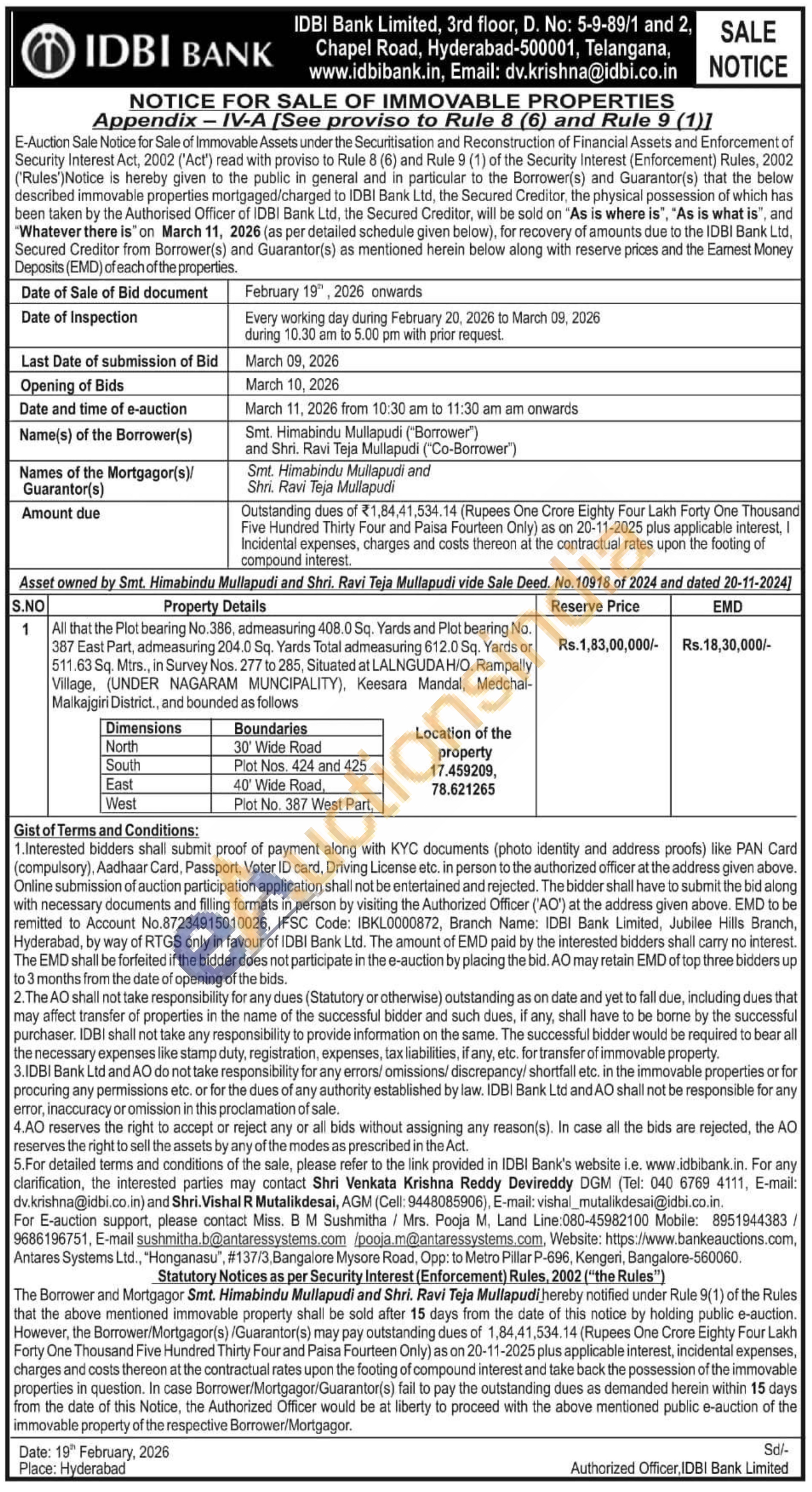 Shri Venkata Krishna Reddy Devireddy DGM (Telephone No : 04067694111) / Shri. Vishal R Mutalikdesai, AGM (Cell No : 9448085906)