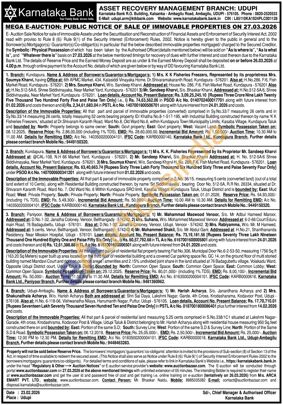 Description of the Immovable Properties: All that part & parcel of residential land measuring 5.25 cents comprised in S.No.338/1C1 situated at Lakshmi Nagar-Garade, 4th cross, Krodashrama, Kodavoor Post & Village, Udupi Taluk & District belonging to Mr. Harish Acharya along with residential house measuring 950 Sq.feet constructed there on and bounded by: East: Portion of the same S.D; South: Survey Line: West: Portion of the same S.D & Survey Line: North: Portion of the Same S.D & Road
