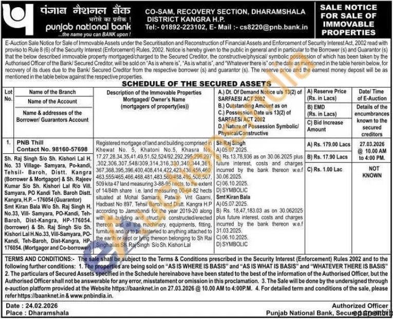 Registered mortgage of land and building comprised in Khewat No. 5. Khatoni No.5, Khasra No. 17,27,28,34,35,41,49,51,52.524/92,292,295,296.297 302,306,307,548/309,314,316,330.340.344.361, 367,368,395,396.400,408,414,422,423,436,456,460, 463,555/465,466,468,481,483,560/488,495,506,507, 509 kita 47 land measuring 3-88-95 hects, to the extent of 14/84th share ie land measuring 00-64-82 hects situated at Mohal Samiara, Patwar- Vrit Gaami, Hadbast No 897. Tehsil Baroh and Distt. Kangra H.P according to Jamabandi for the year 2019-20 along with all building and structure constructed/erected thereon and all the machinery, equipments, fitting, furniture and/or to be fastened to anything attached to the earth or kept or lying thereon belonging to Sh Rai Singh alias Sh. Raj Singh Sio Sh. Kishori Lal