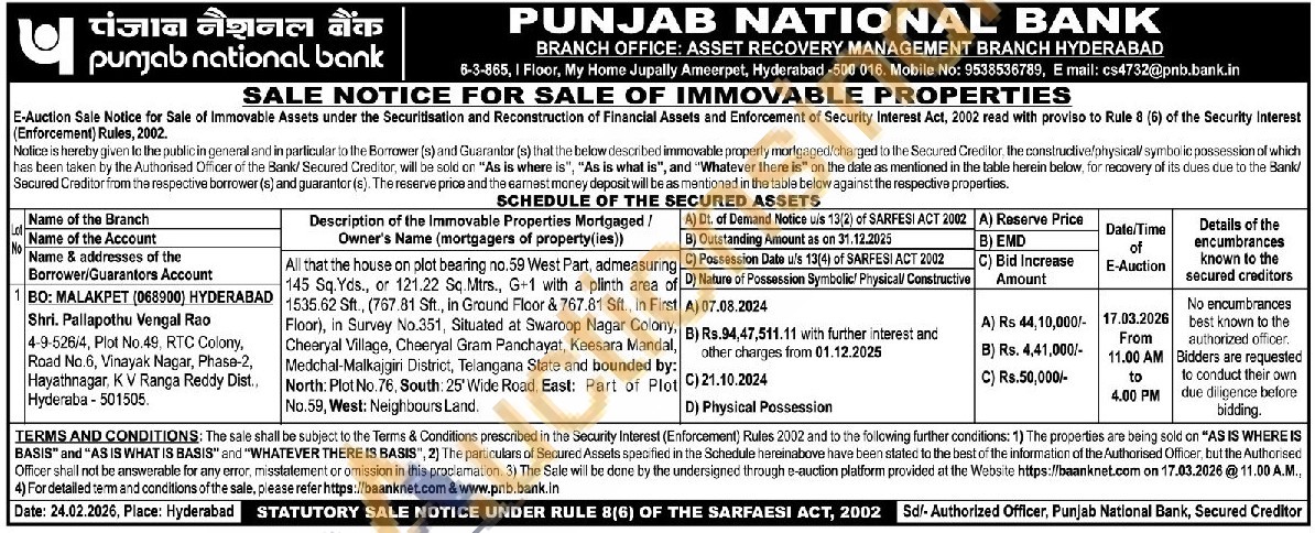 All that the house on plot bearing no. 59 West Part, admeasuring 145 Sq. Yds., or 121.22 Sq. Mtrs., G+1 with a plinth area of 1535.62 Sft., (767.81 Sft., In Ground Floor & 767.81 Sft., in First Floor), in Survey No.351, Situated at Swaroop Nagar Colony, Cheeryal Village, Cheeryal Gram Panchayat, Keesara Mandal, Medchal-Malkajgiri District, Telangana State and bounded by: North: Plot No. 76, South: 25' Wide Road, East: Part of Plot No.59, West: Neighbours Land