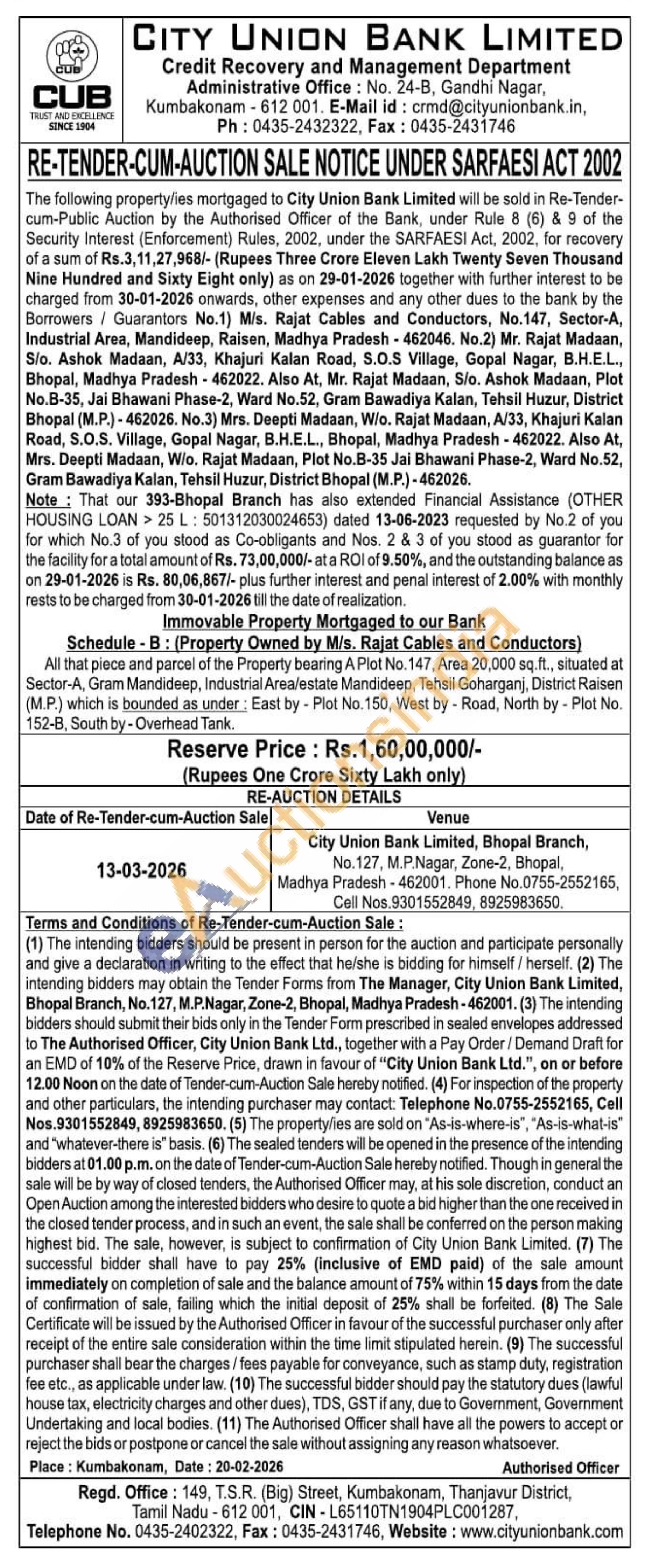All that piece and parcel of the Property bearing A Plot No. 147, Area 20,000 sq.ft., situated at Sector-A, Gram Mandideep, Industrial Area/estate Mandideep, Tehsil Goharganj, District Raisen (M.P.) which is bounded as under: East by - Plot No. 150, West by Road, North by - Plot No. 152-B, South by-Overhead Tank.