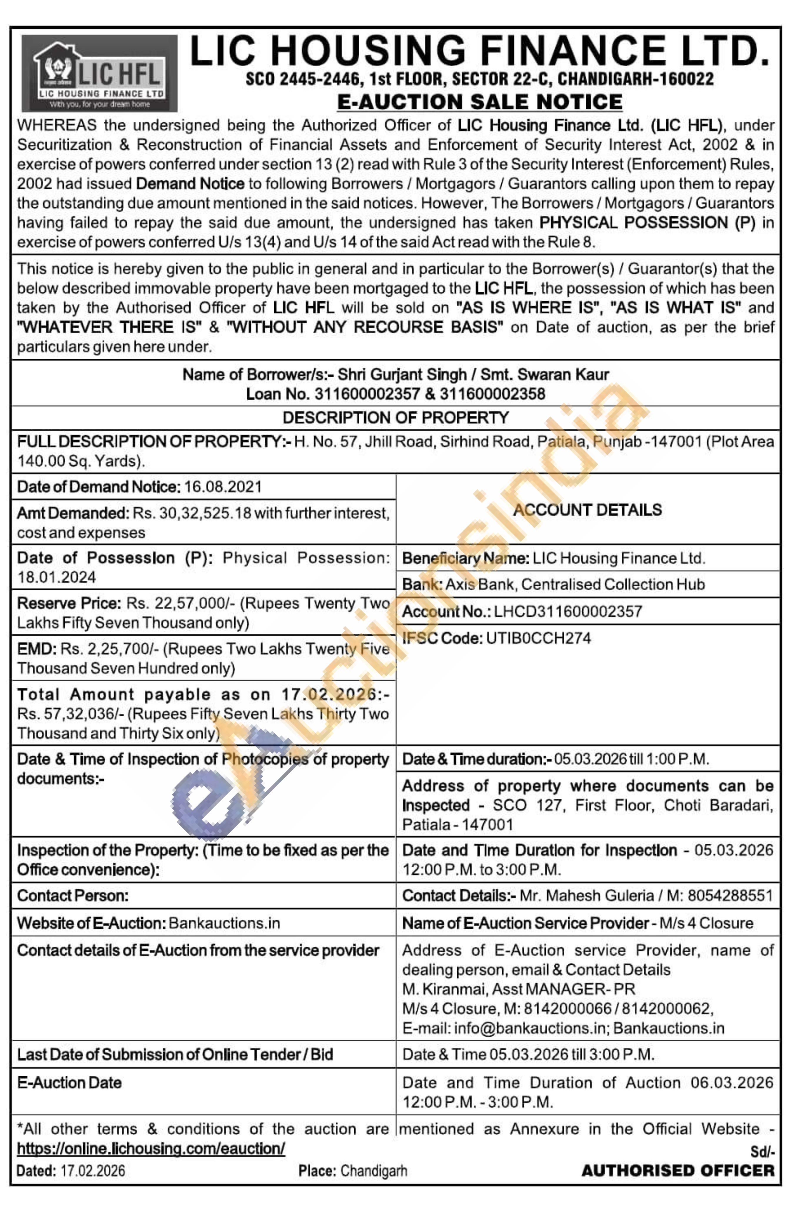FULL DESCRIPTION OF PROPERTY:- H. No. 57, Jhill Road, Sirhind Road, Patiala, Punjab-147001 (Plot Area 140.00 Sq. Yards).