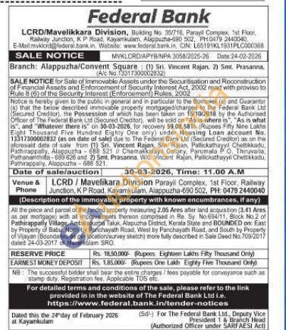 All the piece and parcel parcel of of the landed property measuring 2.05 Ares aller land acquisition (3.41 Ares as per mortgage with all improvements thereon comprised in Re. Sy. No fi4/11, Block No.2 of Pathirappally Village, Ambalapuzha Taluk. Alapuzha District, Kerala State and BOUNDED on: East by Property of Babu, North by Panchayath Road, West by Panchayath Road, and South by Property of Vijayan (Soundaries as per location/survey sketch more fully described in Sale Deed No. 709/2017 dated 24-03-2017 of Mararikulam SRO