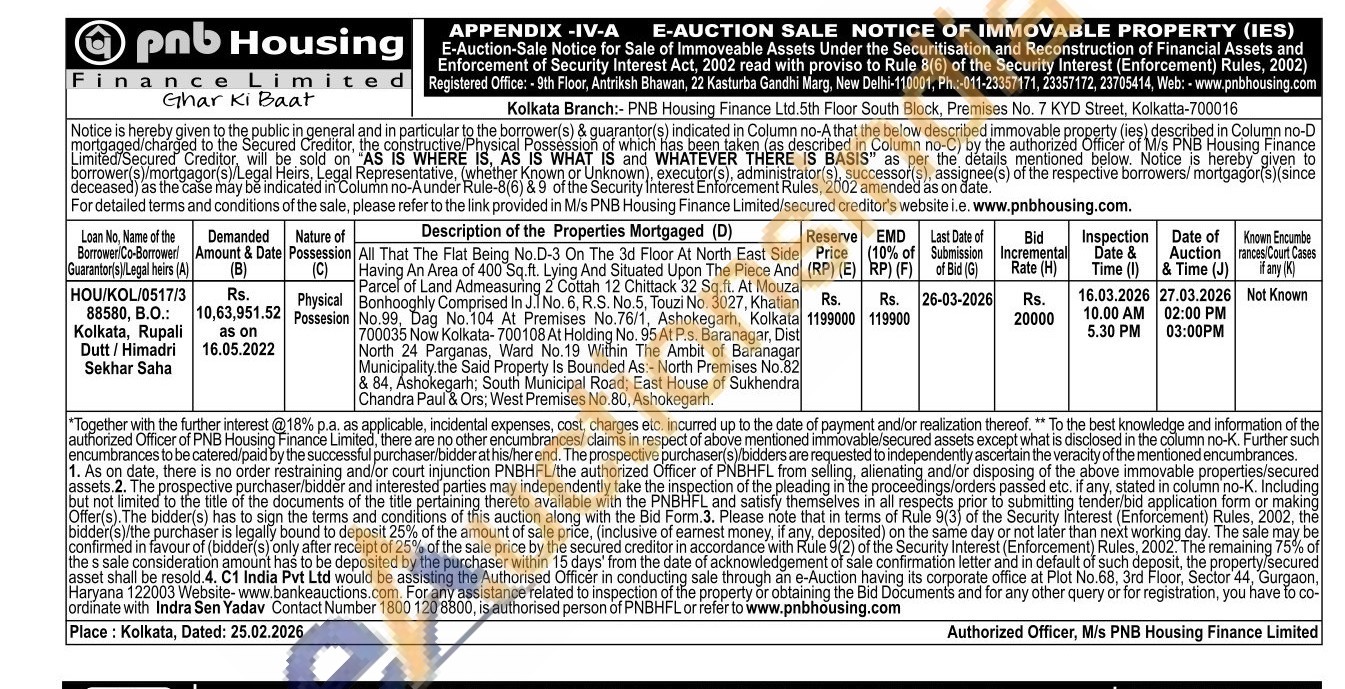 All That The Flat Being No.D-3 On The 3d Floor At North East Side Having An Area of 400 Sq.ft. Lying And Situated Upon The Piece And Parcel of Land Admeasuring 2 Cottah 12 Chittack 32 Sq.ft. At Mouza Bonhooghly Comprised In J. No. 6, R.S. No.5, Touzi No. 3027, Khatian No.99, Dag No.104 At Premises No.76/1, Ashokegarh, Kolkata 700035 Now Kolkata-700108 At Holding No. 95 At P.s. Baranagar, Dist North 24 Parganas, Ward No.19 Within The Ambit of Baranagar Municipality.the Said Property Is Bounded As:- North Premises No.82 & 84, Ashokegarh: South Municipal Road; East House of Sukhendra Chandra Paul & Ors; West Premises No.80, Ashokegarh.