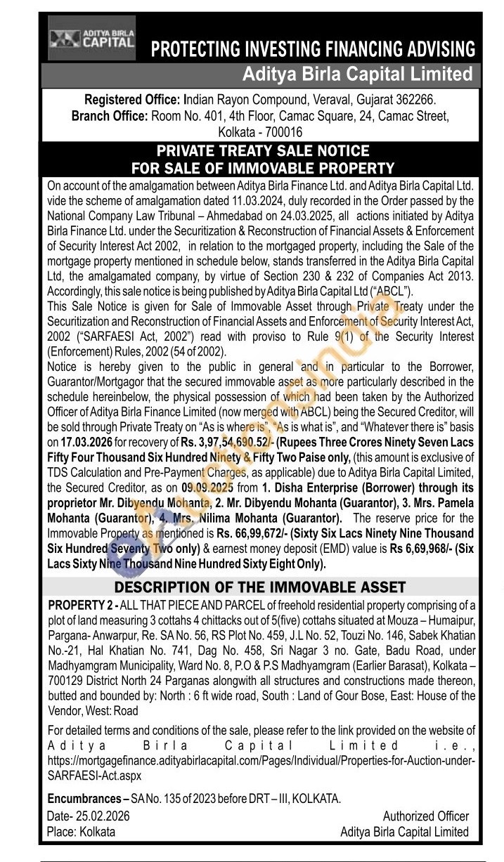 PROPERTY 2-ALL THAT PIECE AND PARCEL of freehold residential property comprising of a plot of land measuring 3 cottahs 4 chittacks out of 5(five) cottahs situated at Mouza-Humaipur, Pargana-Anwarpur, Re. SA No. 56, RS Plot No. 459, J.L No. 52, Touzi No. 146, Sabek Khatian No.-21, Hal Khatian No. 741, Dag No. 458, Sri Nagar 3 no. Gate, Badu Road, under Madhyamgram Municipality, Ward No. 8, P.O & P.S Madhyamgram (Earlier Barasat), Kolkata -700129 District North 24 Parganas alongwith all structures and constructions made thereon, butted and bounded by: North: 6 ft wide road, South: Land of Gour Bose, East: House of the Vendor, West: Road