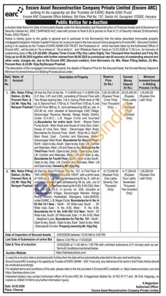All that the Part of site No. 11-2-8/NR and 11-2-8/NR (Old g p no 2-81 and 2-69), consisting of Ground Floor with Two Shops bearing Nos. 38 4, having Plinth area of 766 sq ft Second Floor, 1700 sq. ft. Third Floor 1700 sq. ft. and Narayan Prashad Fourth Floor 968 sq. ft., land admeasuring 290 sq. yds. or & Two Shops bearing Nos. 38 4, having Plinth area of 766 242.46 sq. mtrs situated at Saroonagar (Old) Village, Sarcomagar Revenue Mandal, Ranga Reddy District, Under G.H.M.C., L.B. Nagar Circle and bounded by: Boundaries for entire land: North Bharat Petrol Pump, South: Main Road and House of Uma Devi, East: House of Uma Devi, West: Saroomagar Main Road, Boundaries for Ground Floor, North: Shop No 2, South Main Road, East Corridor and Staircase, West: Sarcomagar Main Road. Boundaries for Second Floor: North: Open to sky, South Open to sky, East: Lift, Comdor and Staircase, West: Lift and Open to sky, Boundaries for Third Floor: North: Open to sky, South: Open to sky, East: Lift, Corridor and Staircase, West: Lift and Open to sky, Boundaries for Fourth Floor: North: Open to sky South: Open to sky, East: Lift, Corridor and Staircase, West: Lift and Open to sky Owned by Mr. Vijay Raj