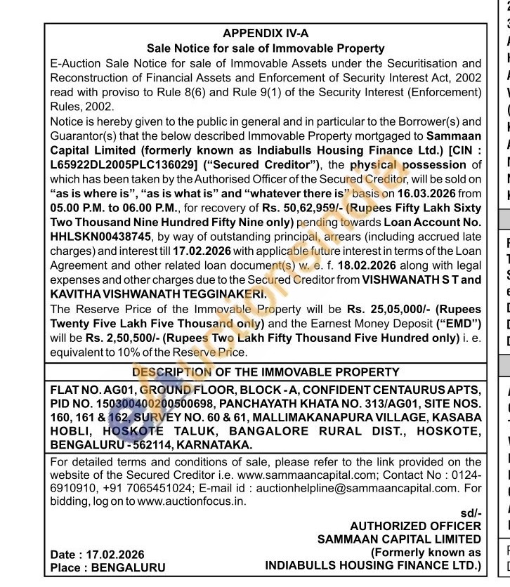 FLAT NO. AG01, GROUND FLOOR, BLOCK-A, CONFIDENT CENTAURUS APTS, PID NO. 150300400200500698, PANCHAYATH KHATA NO. 313/AG01, SITE NOS. 160, 161 & 162, SURVEY NO. 60 & 61, MALLIMAKANAPURA VILLAGE, KASABA HOBLI, HOSKOTE TALUK, BANGALORE RURAL DIST., HOSKOTE, BENGALURU-562114, KARNATAKA.