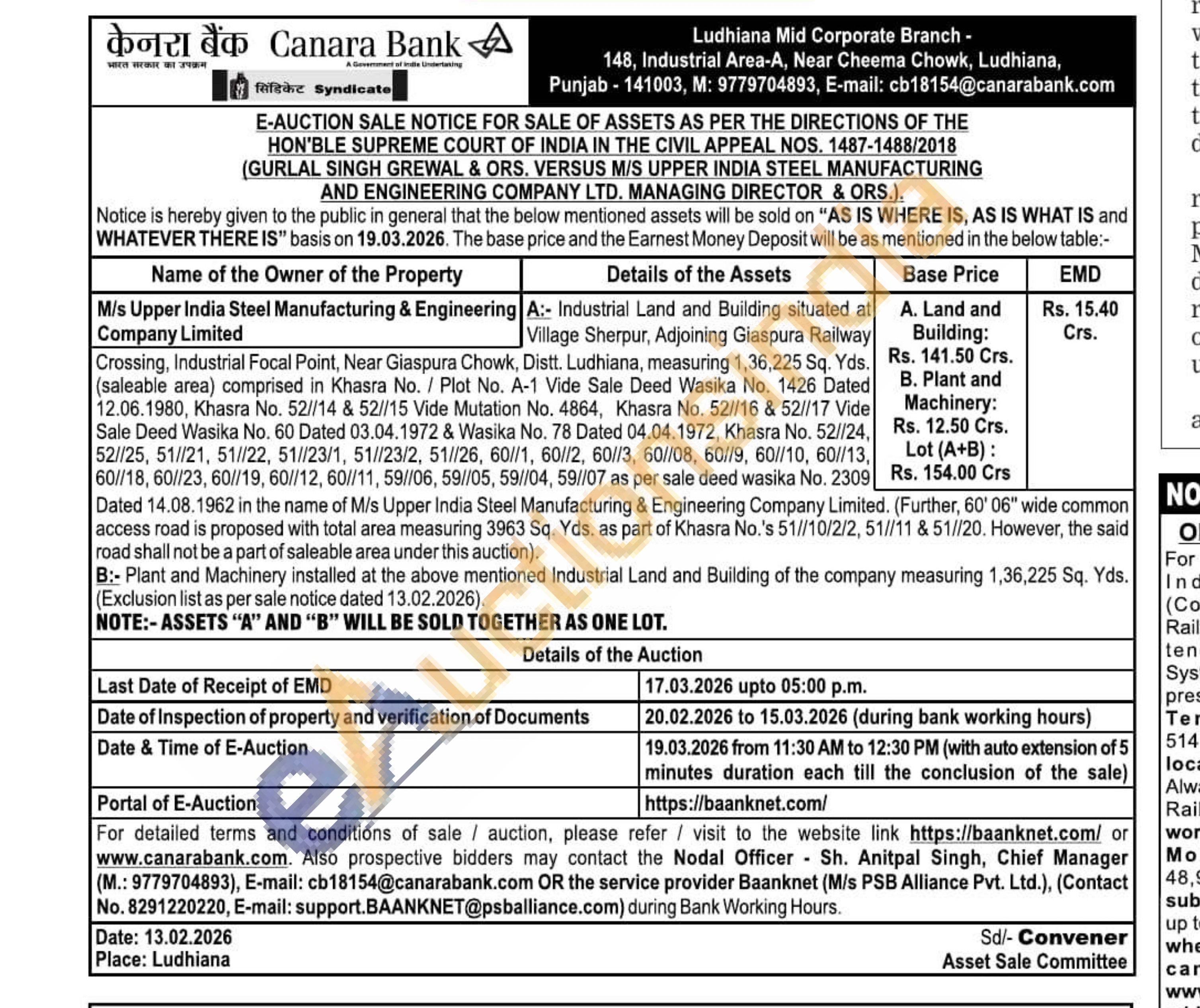 Industrial Land and Building situated at Village Sherpur, Adjoining Giaspura Railway Crossing, Industrial Focal Point, Near Giaspura Chowk, Distt. Ludhiana, measuring 1,36,225 Sq. Yds. (saleable area) comprised in Khasra No. / Plot No. A-1 Vide Sale Deed Wasika No. 1426 Dated 12.06.1980, Khasra No. 52//14 & 52//15 Vide Mutation No. 4864, Khasra No. 52//16 & 52//17 Vide Sale Deed Wasika No. 60 Dated 03.04.1972 & Wasika No. 78 Dated 04.04.1972, Khasra No. 52//24, 52//25, 51//21, 51//22, 51//23/1, 51//23/2, 51//26, 60//1, 60//2, 60//3, 60//08, 60//9, 60//10, 60//13, 60//18, 60//23, 60//19, 60//12, 60//11, 59//06, 59/05, 59//04, 59//07 as per sale deed wasika No. 2309Dated 14.08.1962 in the name of M/s Upper India Steel Manufacturing & Engineering Company Limited. (Further, 60' 06" wide common access road is proposed with total area measuring 3963 Sq. Yds. as part of Khasra No.'s 51//10/2/2, 51//11 & 51//20. However, the said road shall not be a part of saleable area under this auction).