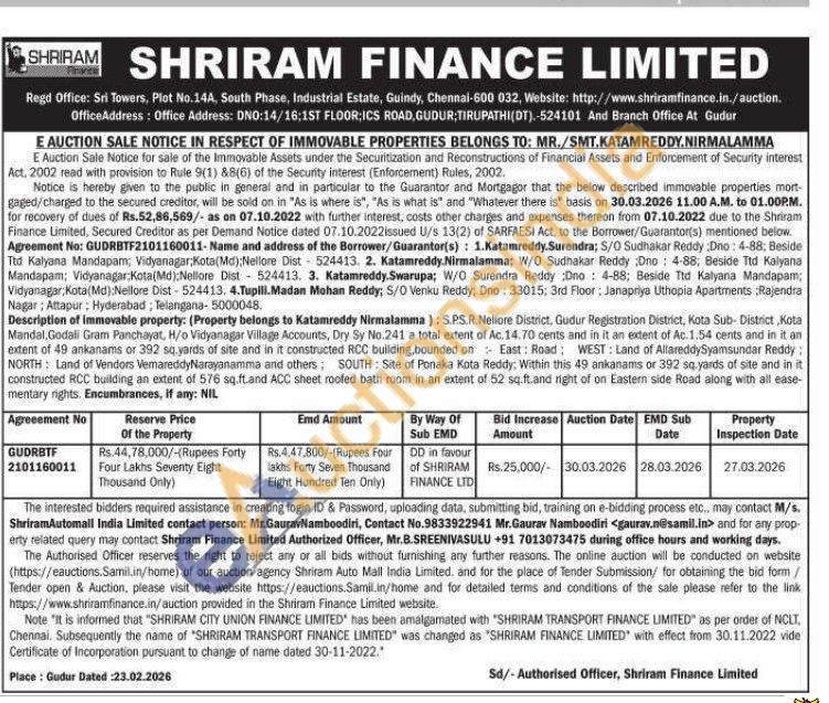 Description of immovable property: (Property belongs to Katamreddy Nirmalamma): S.PS.R. Nellore District. Gudur Registration District, Kota Sub-District, Kota Mandal, Godali Gram Panchayat, H/o Vidyanagar Village Accounts, Dry Sy No.241 a total extent of Ac.14.70 cents and in it an extent of Ac. 1.54 cents and in it an extent of 49 ankanams or 392 sq.yards of site and in it constructed RCC building, bounded on East Road: WEST: Land of AllareddySyamsundar Reddy: NORTH: Land of Vendors VemareddyNarayanamma and others; SOUTH: Site of Ponaka Kota Reddy, Within this 49 ankanams or 392 sq yards of site and in it constructed RCC building an extent of 576 sq.ft.and ACC sheet roofed bath room in an extent of 52 sq.ft.and right of on Eastern side Road along with all ease-mentary rights. Encumbrances, if any: NIL