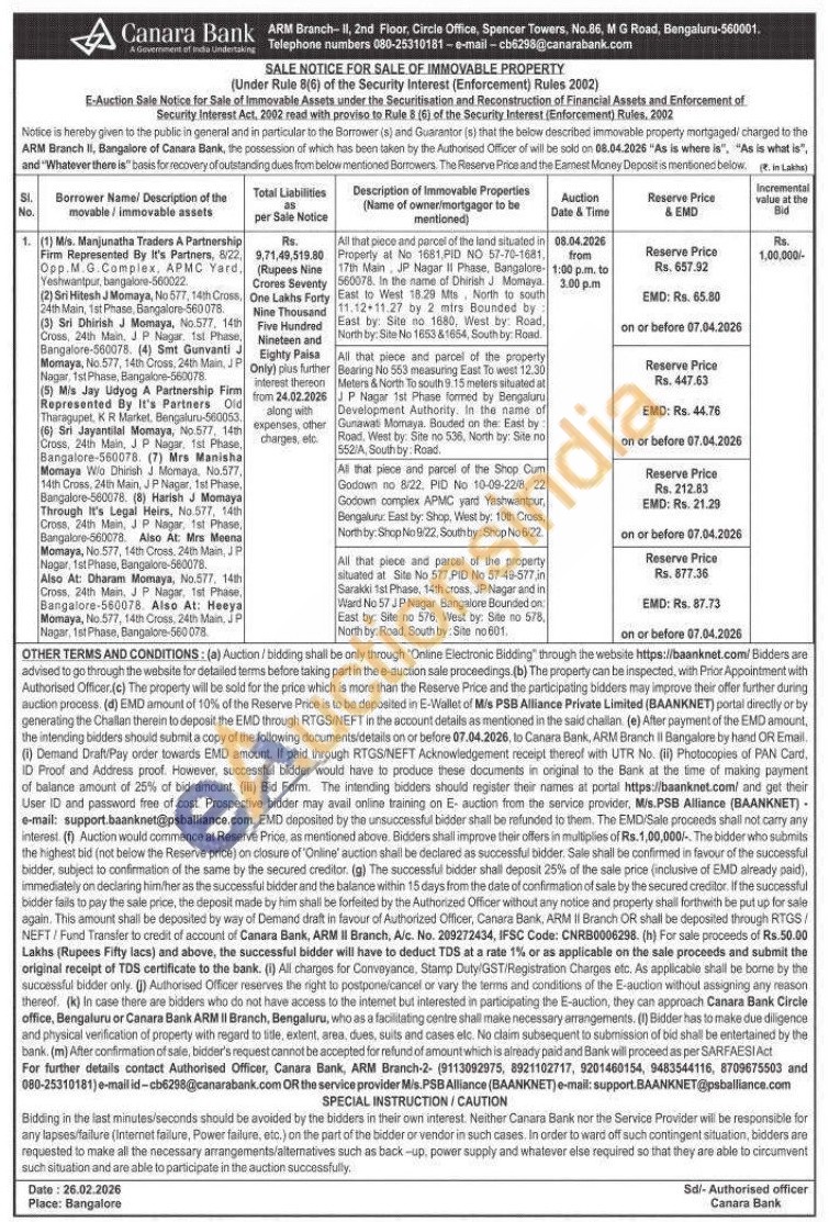 All that piece and parcel of the Shop Cum Godown no 8/22. PID No 10-09-22/8, 22 Godown complex APMC yard Yashwantpur, Bengaluru: East by: Shop, West by: 10th Cross, North by. Shop No 9/22, Southby: Shop No 6/22