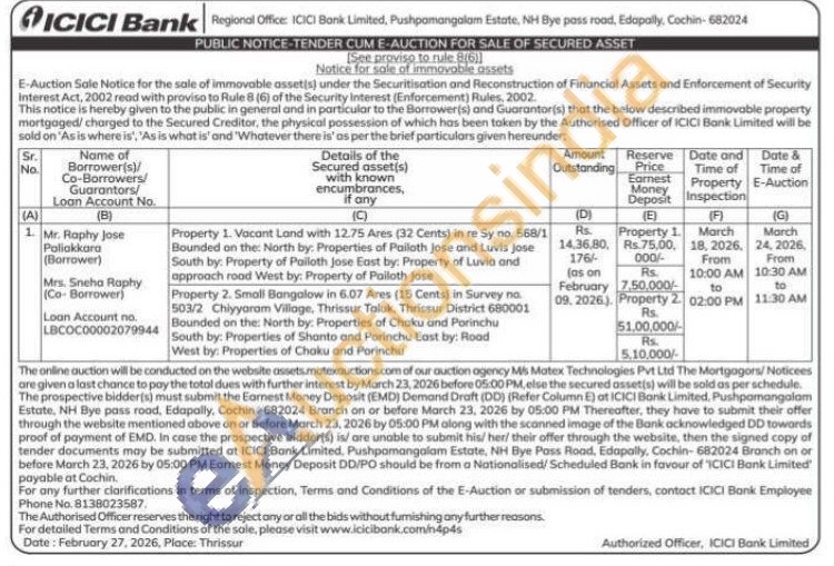 Property 2. Small Bangalow in 6.07 Ares (15 Cents) in Survey no 503/2 Chiyyoram Village, Thrissur Taluk, Thrissur District 680001 Bounded on the: North by: Properties of Chaku and Porinchu South by: Properties of Shanto and Porinchu East by: Road West by: Properties of Chaku and Porinchu