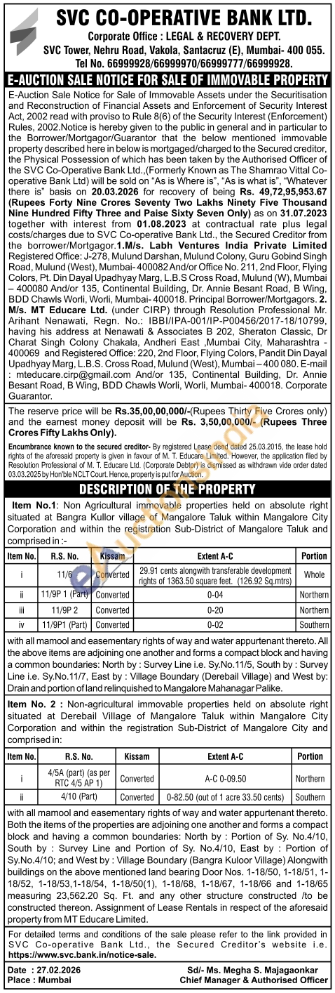 with all mamool and easementary rights of way and water appurtenant thereto. Both the items of the properties are adjoining one another and forms a compact block and having a common boundaries: North by Portion of Sy. No.4/10. South by Survey Line and Portion of Sy. No.4/10, East by Portion of Sy.No.4/10; and West by: Village Boundary (Bangra Kuloor Village) Alongwith buildings on the above mentioned land bearing Door Nos. 1-18/50, 1-18/51, 1-18/52, 1-18/53,1-18/54, 1-18/50(1), 1-18/68, 1-18/67, 1-18/66 and 1-18/65 measuring 23,562.20 Sq. Ft. and any other structure constructed to be constructed thereon. Assignment of Lease Rentals in respect of the aforesaid property from MT Educare Limited