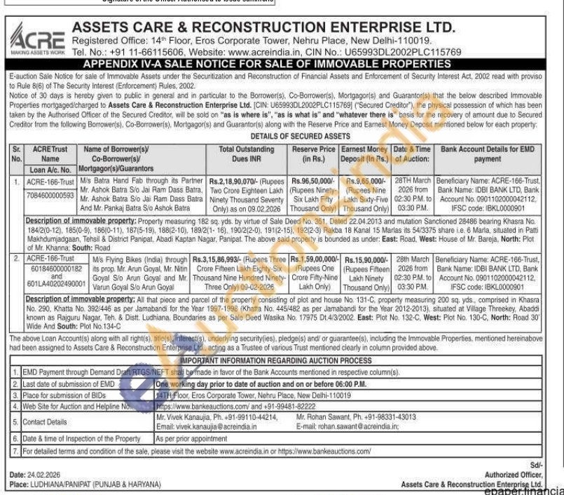 Description of immovable property: Property measuring 182 sq. yds. by virtue of Sale Deed No. 351, Dated 22.04.2013 and mutation Sanctioned 28486 bearing Khasra No 184/2(0-12), 185(0-9), 186(0-11), 187(5-19), 188(2-10), 189/2(1-16), 190/2(2-0), 191(2-15), 192(2-3) Rakba 18 Kanal 15 Marias its 54/3375 share ie. 6 Marla, situated in Patti Makhdumjadgaan, Tehsil & District Panipat, Abadi Kaptan Nagar, Panipat. The above said property is bounded as under: East: Road, West: House of Mr. Bareja, North: Plot of Mr. Khanna, South: Road